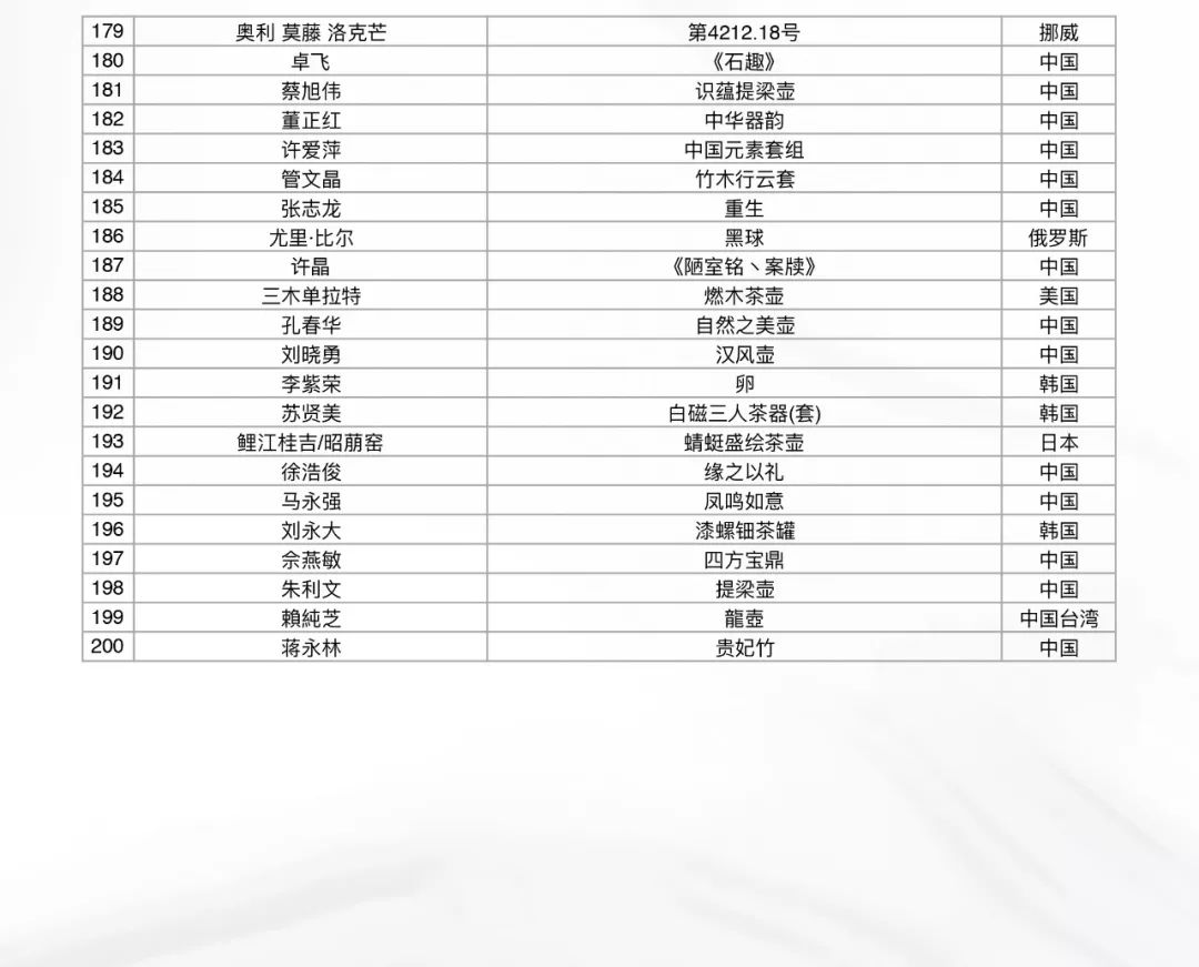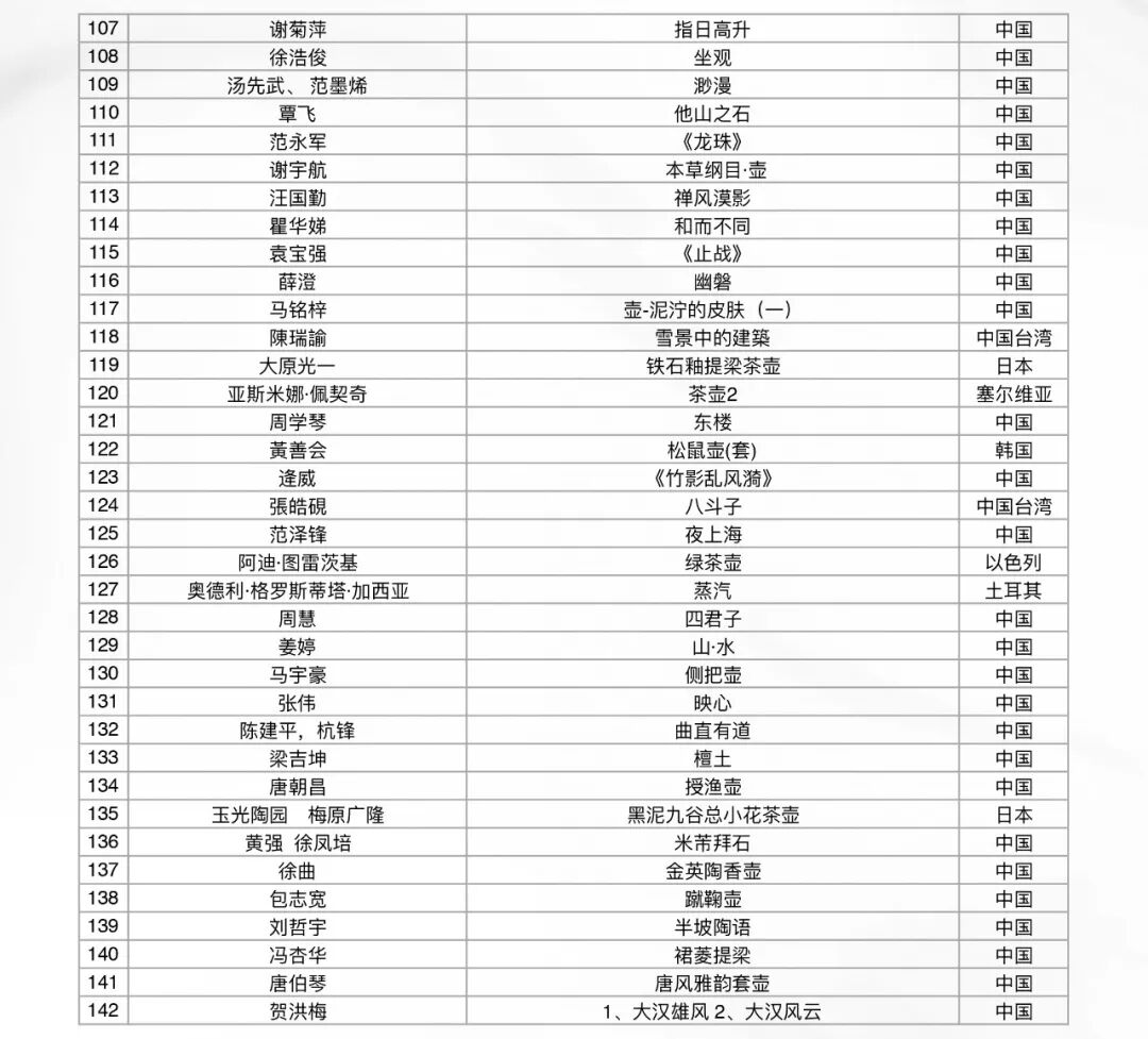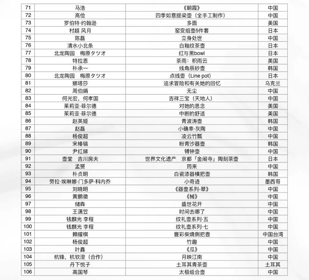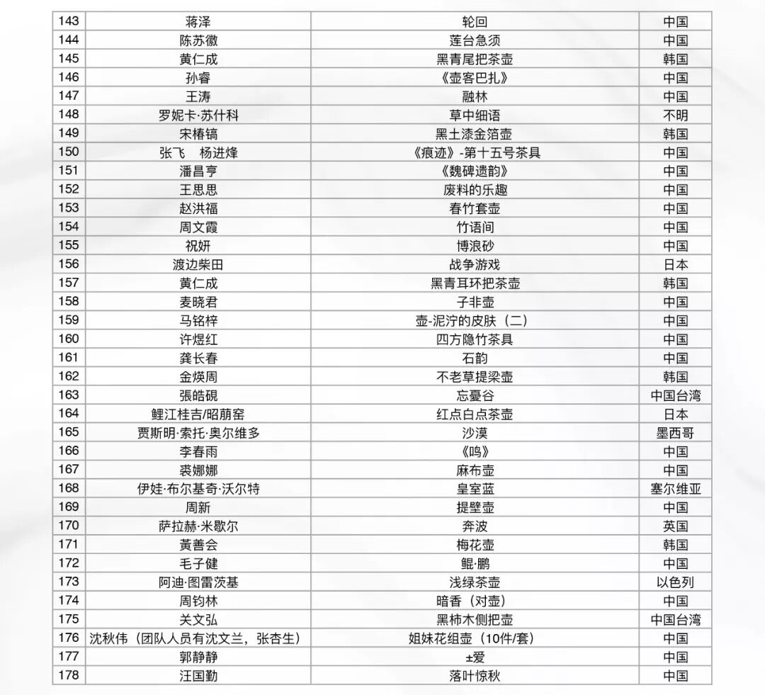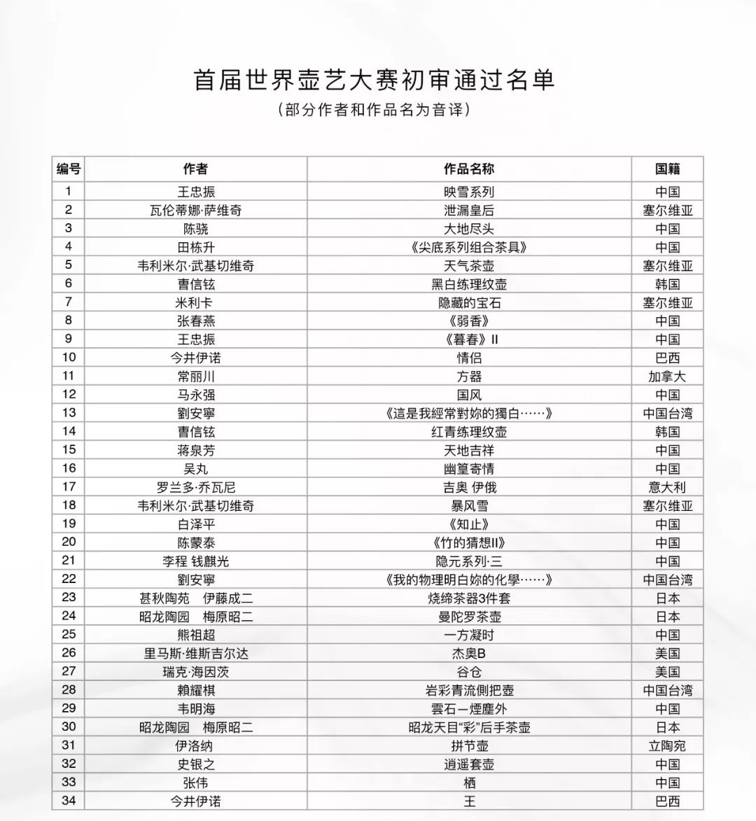 1 2019年8月6日,首届世界壶艺大赛线上初审工作完成。本次活动通过线上报名的方式,共收到来自世界各地的合格作品573件(套)。由IAC成员为主组成的七位评委(如下)历经五天,对参赛作品进行了严格的线上初审。共计选出200件(套)参展作品进行复审(现场评审)。具体名单附后。