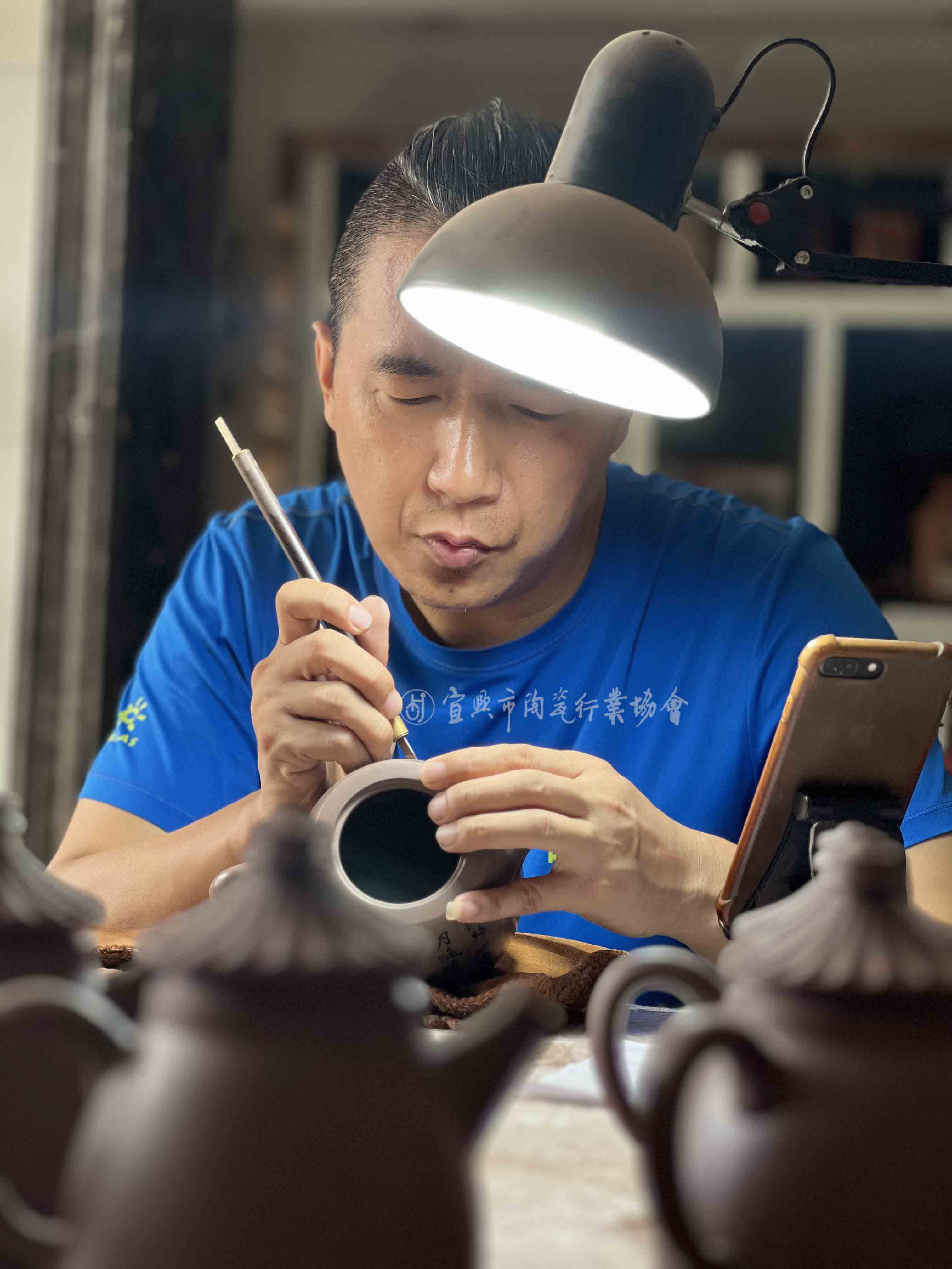 1979年生于宜兴丁蜀。自幼浸润翰墨丹青,1996年师从著名画家曹济民,潜心研习女仕工笔画,于笔墨间筑牢坚实根基。2008年师从国家级高级工艺美术师顾跃鸣先生专攻陶刻,自此刀笔相融,别开生面。其陶刻作品题材广博,山水空灵、花鸟鲜活、人物传神,无不精妙,尤以人物刻画为一绝。每作皆略勾轮廓便操刀直入,以刀代笔,运刀沉稳潇洒而不失法度,刻功老辣醇厚,镌刻挥洒自如。无论构图繁简,皆巧思独运,于方寸紫砂之上,营造出渊穆清华、静谧淡雅的艺术意境,终成潇洒清逸、寓柔秀于阳刚的清劲刻风,深为紫砂界同好所珍赏。