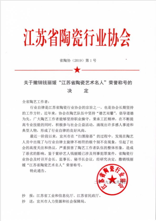 针对钱丽媛事件,宜兴老中青三代紫砂艺人代表座谈表示--- 加强行业自律 纯洁紫砂市场 江苏省陶瓷行业协会撤销钱丽媛“江苏省陶瓷艺术名人”荣誉称号 6月4日宜兴市陶瓷行业协会召开了“宜兴紫砂加强行业自律、促进健康发展”座谈会,会上江苏省陶瓷行业协会决定撤销钱丽媛“江苏省陶瓷艺术名人”荣誉称号。 在座谈会上,徐秀棠、顾绍培、曹亚麟、吴鸣、陈国良、许艳春、史小明、范泽锋等老中青三代紫砂艺人代表表示,将不忘初心、秉承工匠精神,加强行业自律,诚信守法经营,坚持从我做起,纯洁紫砂市场,共同爱护好紫砂这张宜兴的城市名片。 据宜兴市公安部门(副局长储小悦)介绍,去年中央部署扫黑除恶专项斗争以来,宜兴警方重视线索滚动排查,在其他警情回访过程中获取相关线索,经过梳理分析研判,于2019年1月至今,相继抓获以邵洪群为首的涉恶团伙,他们以恐吓、威胁等手法实施敲诈勒索。其中,涉及钱丽媛的案件,主要是其徒弟郑某为其代工产生纠纷后,钱丽媛指使其干儿子丁某纠集邵洪群等人对郑某实施敲诈勒索。现全案已经告破,所有涉案嫌疑人均已到案。目前,宜兴市人民检察院已对邵洪群等4名恶势力犯罪集团成员和涉案的其他人员钱丽媛等3人提起公诉。 “钱丽媛案件的发生,给宜兴紫砂和城市声誉带来极坏的影响。但这只是少数‘害群之马’的个体案件,不是宜兴紫砂行业的普遍现象。”宜兴市陶瓷行业协会史俊棠会长介绍说,宜兴紫砂文化源远流长,紫砂是宜兴一张靓丽的名片,紫砂产业也是一个特色产业和富民产业。改革开放以来尤其是近20年来,宜兴紫砂经济发展强劲,紫砂文化繁荣昌盛,紫砂人才不断涌现,紫砂技艺传承有序,紫砂创新层出不穷。不完全统计,目前,宜兴直接紫砂从业者已达3万余人。其中,涌现出一大批德艺双馨的名家大师,他们普遍爱国敬业、遵纪守法,坚守传统技艺,传承工匠精神,为传播和弘扬宜兴紫砂文化作出了巨大的贡献。此次钱丽媛事件是紫砂行业的极个别现象,但这也暴露了极少数紫砂从业者法律意识、诚信意识淡薄,紫砂行业自律性不足等问题。宜兴市陶瓷行业协会将以此为契机,净化行业环境,进一步引导、教育紫砂从业者遵纪守法,同时建立相应的行业退出机制,促进我市紫砂行业持续健康发展。 宜兴市委宣传部副部长蒋永芳表示,感谢媒体对紫砂行业的报道,同时希望媒体能一如既往的聚焦关注,切实报道紫砂行业的发展,弘扬紫砂正气。丁蜀镇镇长任飞同时表示,紫砂是我们共同的精神家园,只有倍加呵护,才能持久绽放光彩。下阶段,丁蜀镇将怀着如履薄冰的责任感和敬畏感,切实强化行业的规范管理,围绕监管的薄弱环节,加强研究、健全制度,进一步织密紫砂行业监管网络、堵塞监管疏漏,全面落实好促进紫砂行业健康发展的各项措施,积极推进紫砂合作经营和紫砂市场的网格化管理,全力维护好丁蜀紫砂界的良好生态。 座谈会上,宜兴市人社、工信、市场监管、文体广电旅游等部门就如何发挥自身职能,进一步加强行业监管,推动紫砂产业健康发展,促进紫砂文化繁荣发展提出了一系列举措。 其中,宜兴市人社局局长花强表示,市人社局将强化紫砂行业专业技术职称管理,对于虚假宣传、欺诈销售、以假乱真等不良行为者,不予注册;在职称申报审核过程中,注重职业道德和艺德艺风的要求,对于请人代工、混淆市场、欺骗消费者的紫砂从业人员,一经查实坚决予以曝光。 市工业和信息化局局长蒋惠清表示,市工信局将切实加强现有技艺人员队伍管理,倡议建立健全个人诚信体系建设管理体系,一经发现违规违法行为,坚决给予严肃处理,并探索建立从业“黑名单”制度。 市市场监督管理局局长陈法荣表示,市场监管局将进一步畅通消费者维权渠道,对涉及紫砂代工等问题的投诉举报信息进行详细研判,增强发现违法线索和处置违法问题的能力;进一步创新市场监管手段,加强对紫砂行业经营户的检查频次。 市文体广电和旅游局局长许夕华表示,市文旅局将对非遗代表性传承人申报的“德行”提出更高的要求,不让德行有失的人员进入代表性传承人队伍,对触犯国家法律法规、影响行业形象的代表性传承人坚决予以退出;在文化交流活动中,对存在负面影响的紫砂艺人坚持“零容忍”等。 此外,宜兴市人社局、工信局还将提请上级部门,依法依规取消钱丽媛正高级工艺美术师职称、“江苏省工艺美术名人”荣誉称号。